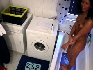Slutty black chick takes white cock in bathroom