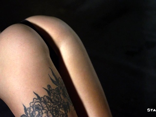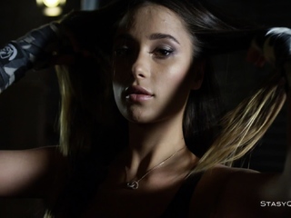 Babe stripping and teasing with her freshly shaved pussy