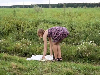 Horny babe Oxana Chic is outside in a hay field, all alone