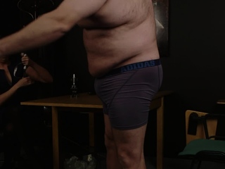 SPH femdom babe gives CFNM HJ to fat guy