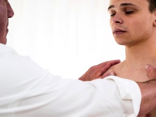Suited men inserts big dildos inside twink